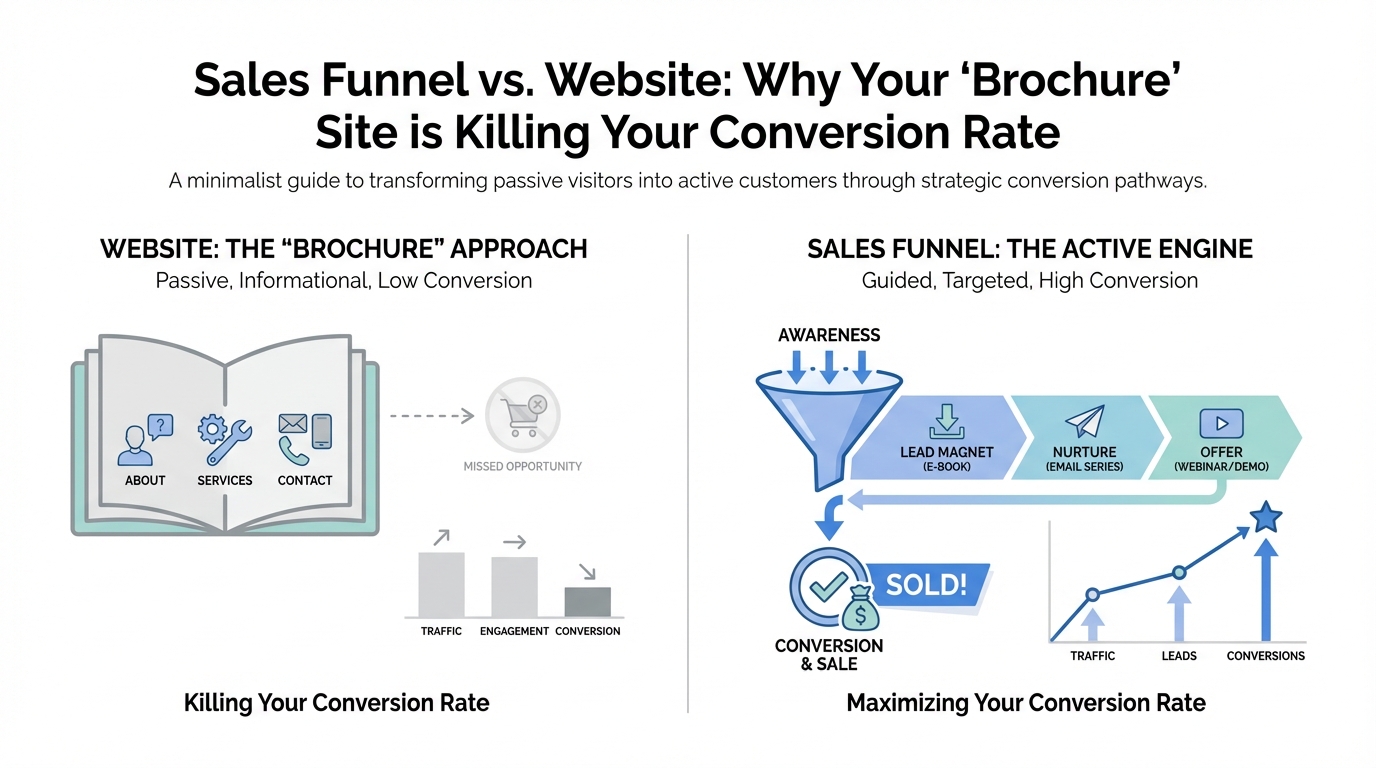 Most startup founders spend months — and thousands of dollars — obsessing over their website. They tweak the hex codes, debate the hero imagery, and polish the 'About Us' page until it shines. But here is the cold, hard truth: for the vast majority of businesses, a traditional website is a leaky bucket. According to conversion rate benchmarks, while you are admiring your clean UI, 98% of your traffic is quietly slipping out the back door without ever leaving an email address or booking a call. This is the fundamental struggle of the sales funnel vs website debate, and choosing the wrong side is likely killing your growth.
