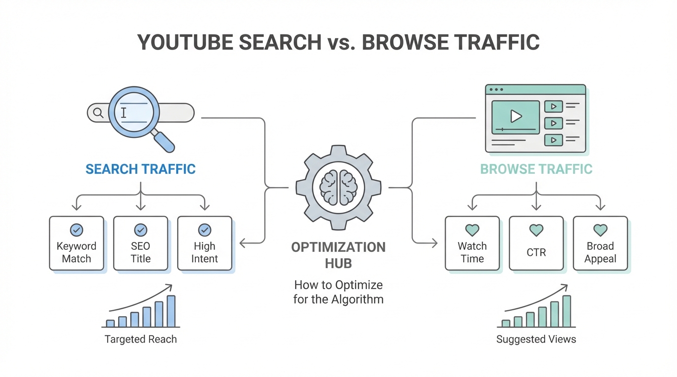 When you upload a video to YouTube, you aren't just publishing content; you are launching a product into a massive global marketplace with over two billion monthly active users. For many creators and brand marketers, the YouTube algorithm feels like a black box, a mysterious force that randomly chooses winners and losers. However, growth on the platform is less about luck and more about understanding the technical nuances of YouTube browse vs search traffic. Whether you are aiming for evergreen search visibility or the viral velocity of the home page, your optimization strategy must shift to match user intent. This guide will provide a comprehensive YouTube algorithm guide to help you master both traffic sources and significantly increase YouTube click through rate (CTR) across your entire channel.